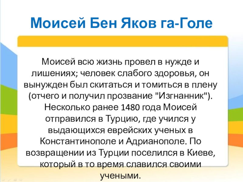 человек слабого здоровья, он вынужден был скитаться и томиться в плену (отчего и получил прозвание "Изгнанник"). Несколько ранее 1480 года Моисей отправился в Турцию, где учился у выдающихся еврейских ученых в Константинополе и Адрианополе. По возвращении из Турции поселился в Киеве, который в то время славился своими учеными.