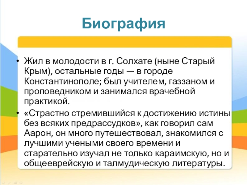 «Страстно стремившийся к достижению истины без всяких предрассудков», как говорил сам Аарон, он много путешествовал, знакомился с лучшими учеными своего времени и старательно изучал не только караимскую, но и общееврейскую и талмудическую литературы.