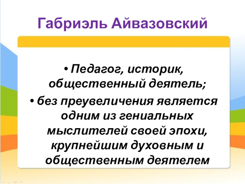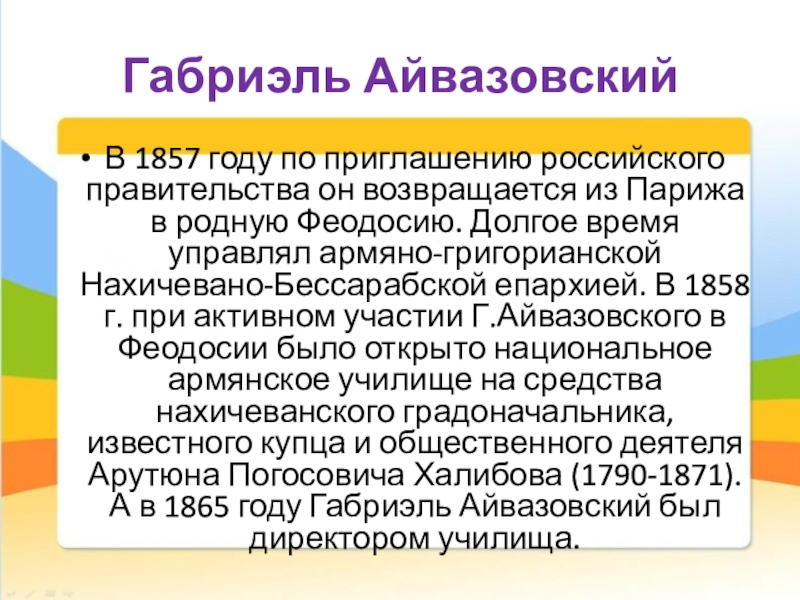 Парижа в родную Феодосию. Долгое время управлял армяно-григорианской Нахичевано-Бессарабской епархией. В 1858 г. при активном участии Г.Айвазовского в Феодосии было открыто национальное армянское училище на средства нахичеванского градоначальника, известного купца и общественного деятеля Арутюна Погосовича Халибова (1790-1871). А в 1865 году Габриэль Айвазовский был директором училища.