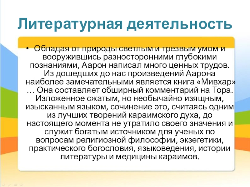 глубокими познаниями, Аарон написал много ценных трудов. Из дошедших до нас произведений Аарона наиболее замечательными является книга «Мивхар»… Она составляет обширный комментарий на Тора. Изложенное сжатым, но необычайно изящным, изысканным языком, сочинение это, считаясь одним из лучших творений караимского духа, до настоящего момента не утратило своего значения и служит богатым источником для ученых по вопросам религиозной философии, экзегетики, практического богословия, языковедения, истории литературы и медицины караимов.