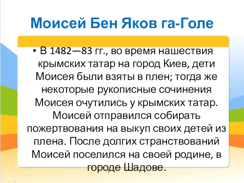 на город Киев, дети Моисея были взяты в плен; тогда же некоторые рукописные сочинения Моисея очутились у крымских татар. Моисей отправился собирать пожертвования на выкуп своих детей из плена. После долгих странствований Моисей поселился на своей родине, в городе Шадове.