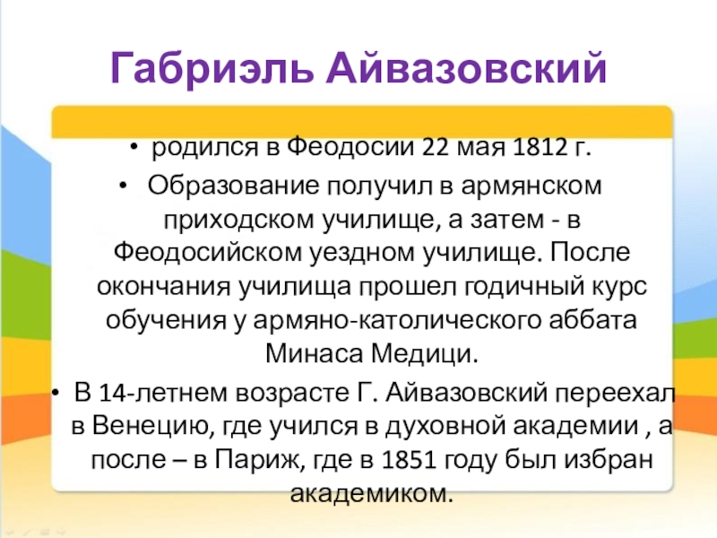 В 14-летнем возрасте Г. Айвазовский переехал в Венецию, где учился в духовной академии , а после – в Париж, где в 1851 году был избран академиком.