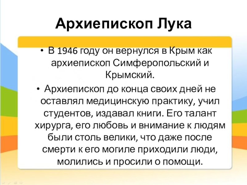 Архиепископ до конца своих дней не оставлял медицинскую практику, учил студентов, издавал книги. Его талант хирурга, его любовь и внимание к людям были столь велики, что даже после смерти к его могиле приходили люди, молились и просили о помощи.