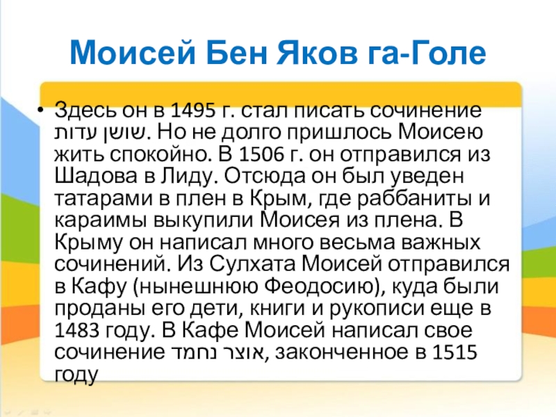 שושן עדות. Но не долго пришлось Моисею жить спокойно. В 1506 г. он отправился из Шадова в Лиду. Отсюда он был уведен татарами в плен в Крым, где раббаниты и караимы выкупили Моисея из плена. В Крыму он написал много весьма важных сочинений. Из Сулхата Моисей отправился в Кафу (нынешнюю Феодосию), куда были проданы его дети, книги и рукописи еще в 1483 году. В Кафе Моисей написал свое сочинение אוצר נחמד, законченное в 1515 году