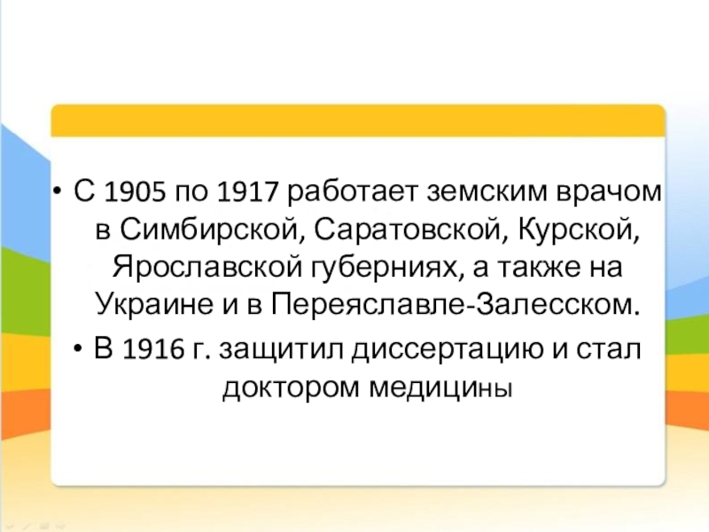 С 1905 по 1917 работает земским врачом в Симбирской, Саратовской, Курской,