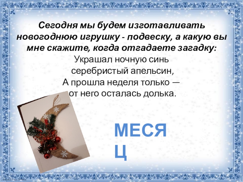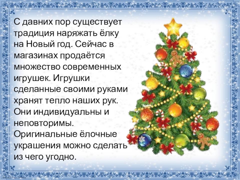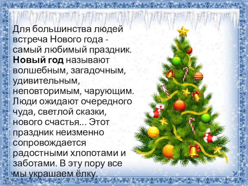 называют волшебным, загадочным, удивительным, неповторимым, чарующим. Люди ожидают очередного чуда, светлой сказки, нового счастья... Этот праздник неизменно сопровождается радостными хлопотами и заботами. В эту пору все мы украшаем ёлку.