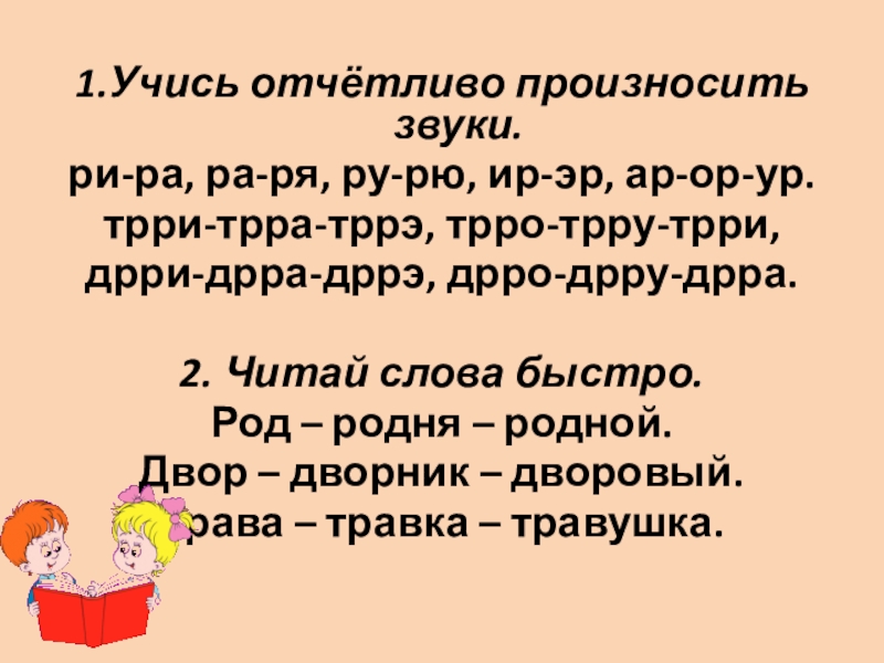 1.Учись отчётливо произносить звуки.ри-ра, ра-ря, ру-рю, ир-эр, ар-ор-ур.трри-трра-тррэ, трро-трру-трри,дрри-дрра-дррэ, дрро-дрру-дрра. 2. Читай слова быстро.Род – родня – родной.Двор