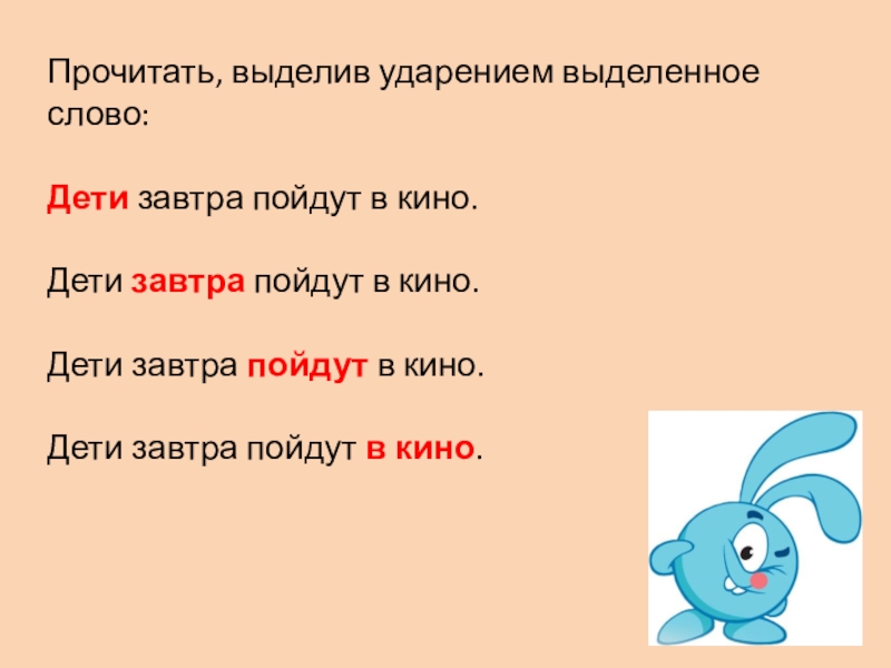 Прочитать, выделив ударением выделенное слово:Дети завтра пойдут в кино.Дети завтра пойдут в кино.Дети завтра пойдут в кино.Дети
