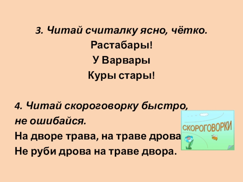 3. Читай считалку ясно, чётко.Растабары!У ВарварыКуры стары! 4. Читай скороговорку быстро,не ошибайся.На дворе трава, на траве дрова.Не руби