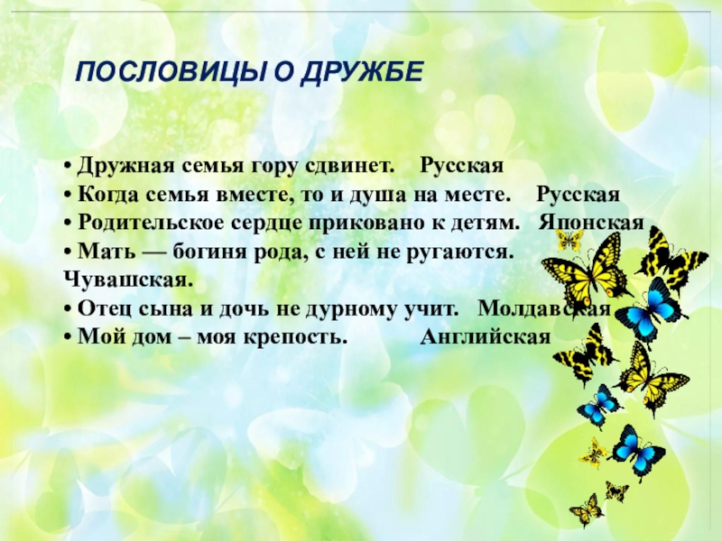 ПОСЛОВИЦЫ О ДРУЖБЕ• Дружная семья гору сдвинет.  Русская • Когда семья вместе, то и душа на
