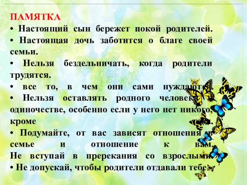 Слайд 11ПАМЯТКА • Настоящий сын бережет покой родителей. • Настоящая дочь заботится о благе