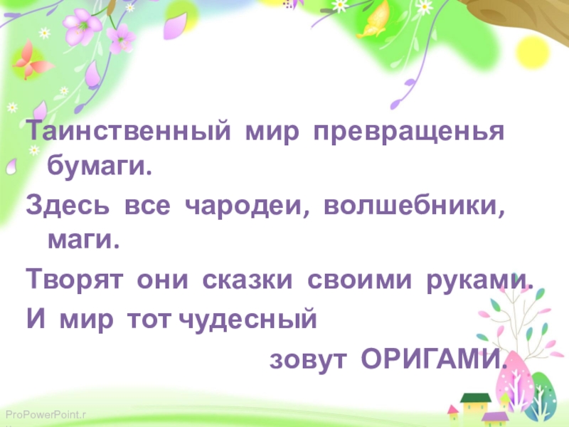 Таинственный  мир  превращенья  бумаги.Здесь  все  чародеи,  волшебники,  маги.Творят  они  сказки  своими  руками.И  мир  тот чудесный