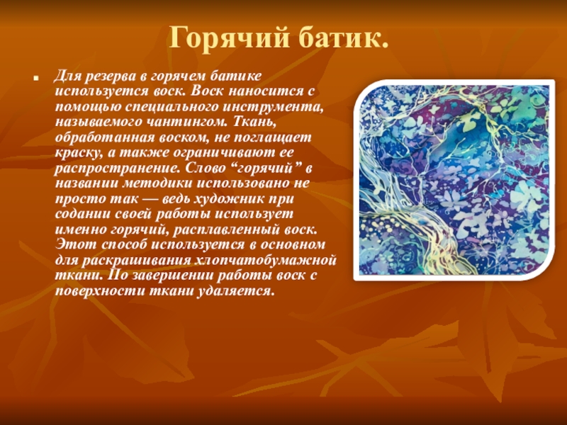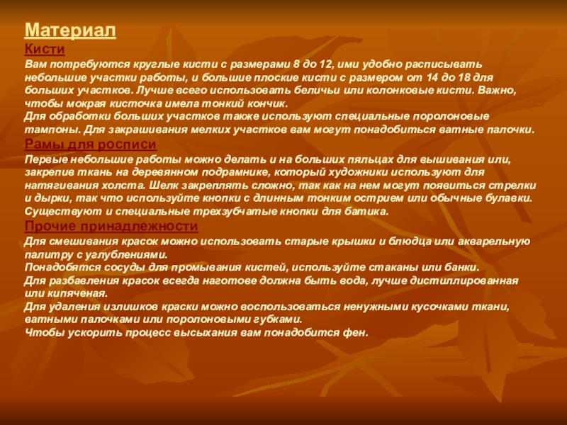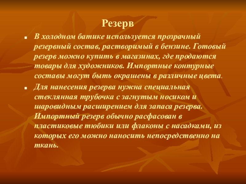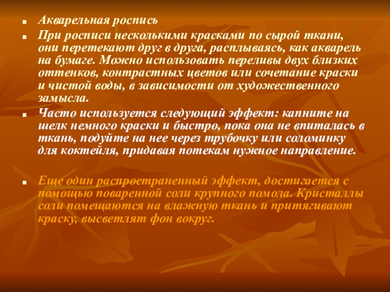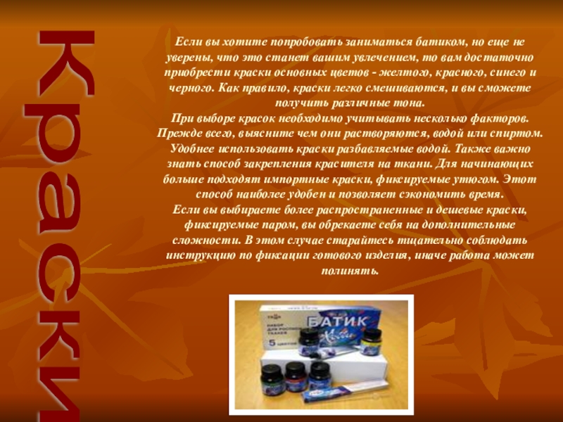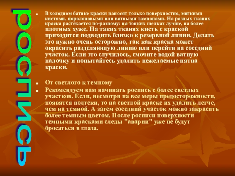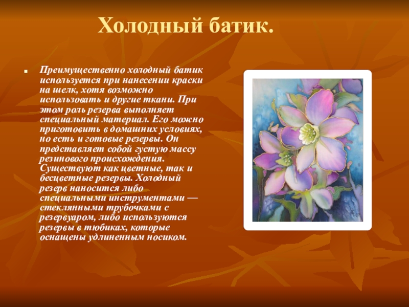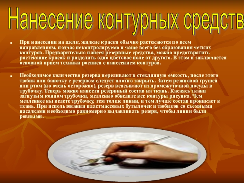 ткани жидкими красками. Каждой художнице, занимающейся росписью по шелку, знакома ситуация, когда разъединяющая линия не "держит". Это проявляется в том, что жидкая краска для росписи по шелку перетекает на соседнее поле. Подобные ситуации являются поводом для огорчений и нарушают процесс росписи.