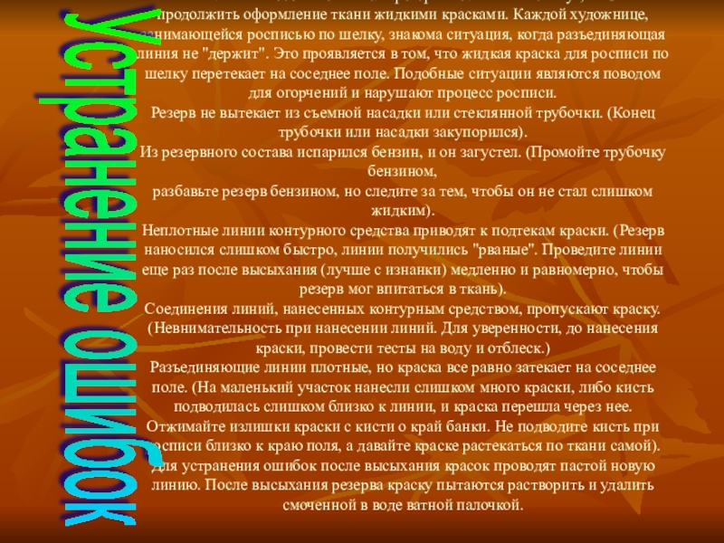 Для устранения ошибок после высыхания красок проводят пастой новую линию. После высыхания резерва краску пытаются растворить и удалить смоченной в воде ватной палочкой.