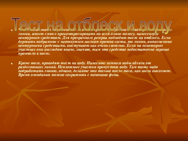 Соединения линий, нанесенных контурным средством, пропускают краску. (Невнимательность при нанесении линий. Для уверенности, до нанесения краски, провести тесты на воду и отблеск.)