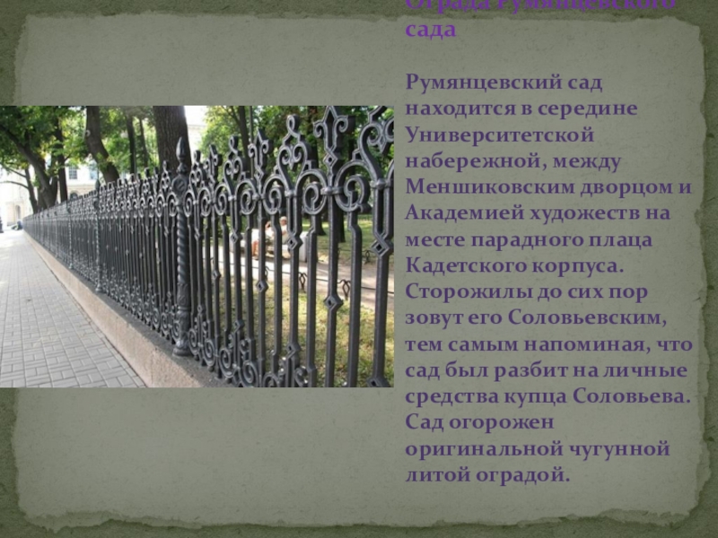 дворцом и Академией художеств на месте парадного плаца Кадетского корпуса. Сторожилы до сих пор зовут его Соловьевским, тем самым напоминая, что сад был разбит на личные средства купца Соловьева. Сад огорожен оригинальной чугунной литой оградой.