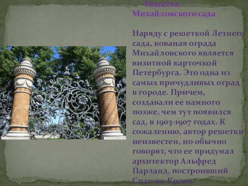 визитной карточкой Петербурга. Это одна из самых причудливых оград в городе. Причем, создавали ее намного позже, чем тут появился сад, в 1903-1907 годах. К сожалению, автор решетки неизвестен, но обычно говорят, что ее придумал архитектор Альфред Парланд, построивший Спас-на-Крови.