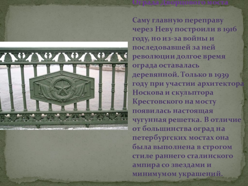 но из-за войны и последовавшей за ней революции долгое время ограда оставалась деревянной. Только в 1939 году при участии архитектора Носкова и скульптора Крестовского на мосту появилась настоящая чугунная решетка. В отличие от большинства оград на петербургских мостах она была выполнена в строгом стиле раннего сталинского ампира со звездами и минимумом украшений.