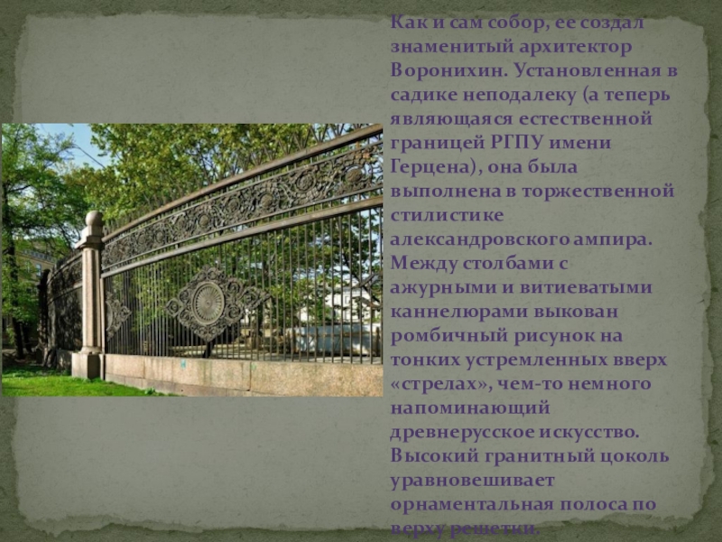 Воронихин. Установленная в садике неподалеку (а теперь являющаяся естественной границей РГПУ имени Герцена), она была выполнена в торжественной стилистике александровского ампира. Между столбами с ажурными и витиеватыми каннелюрами выкован ромбичный рисунок на тонких устремленных вверх «стрелах», чем-то немного напоминающий древнерусское искусство. Высокий гранитный цоколь уравновешивает орнаментальная полоса по верху решетки.
