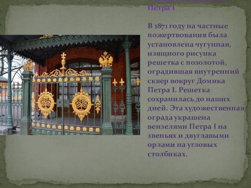 установлена чугунная, изящного рисунка решетка с позолотой, оградившая внутренний сквер вокруг Домика Петра I. Решетка сохранилась до наших дней. Эта художественная ограда украшена вензелями Петра I на звеньях и двуглавыми орлами на угловых столбиках.