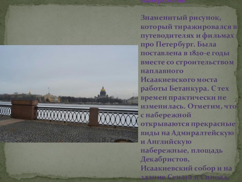 Петербург. Была поставлена в 1820-е годы вместе со строительством наплавного Исаакиевского моста работы Бетанкура. С тех времен практически не изменилась. Отметим, что с набережной открываются прекрасные виды на Адмиралтейскую и Английскую набережные, площадь Декабристов, Исаакиевский собор и на здание Сената и Синода.