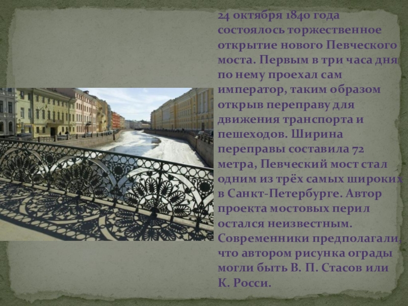 моста. Первым в три часа дня по нему проехал сам император, таким образом открыв переправу для движения транспорта и пешеходов. Ширина переправы составила 72 метра, Певческий мост стал одним из трёх самых широких в Санкт-Петербурге. Автор проекта мостовых перил остался неизвестным. Современники предполагали, что автором рисунка ограды могли быть В. П. Стасов или К. Росси.