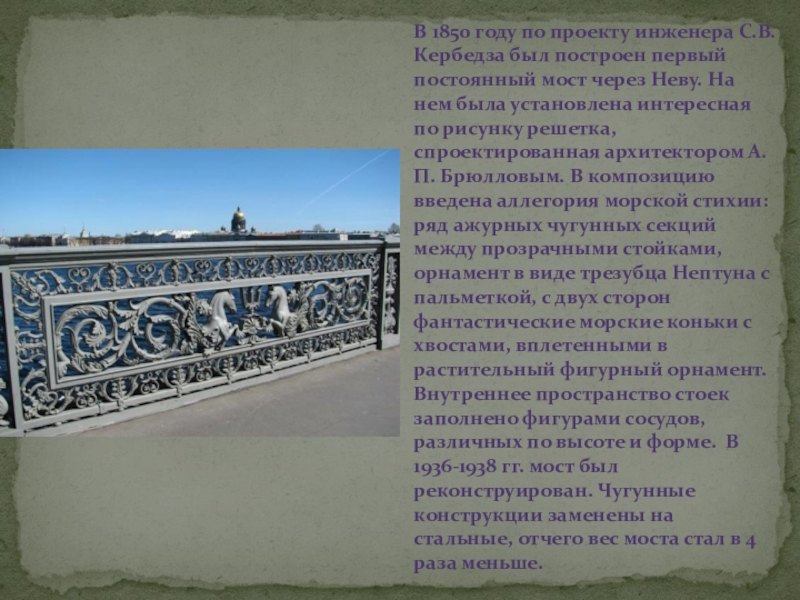 построен первый постоянный мост через Неву. На нем была установлена интересная по рисунку решетка, спроектированная архитектором А.П. Брюлловым. В композицию введена аллегория морской стихии: ряд ажурных чугунных секций между прозрачными стойками, орнамент в виде трезубца Нептуна с пальметкой, с двух сторон фантастические морские коньки с хвостами, вплетенными в растительный фигурный орнамент. Внутреннее пространство стоек заполнено фигурами сосудов, различных по высоте и форме. В 1936-1938 гг. мост был реконструирован. Чугунные конструкции заменены на стальные, отчего вес моста стал в 4 раза меньше.