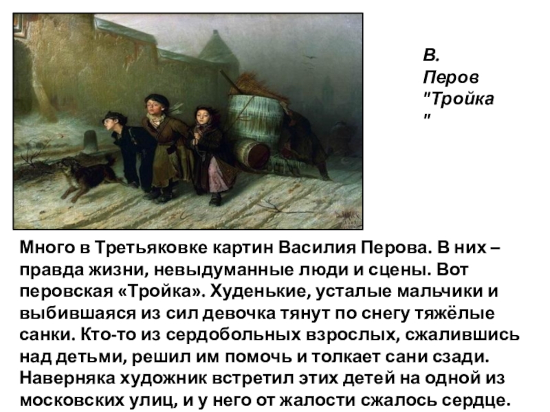 правда жизни, невыдуманные люди и сцены. Вот перовская «Тройка». Худенькие, усталые мальчики и выбившаяся из сил девочка тянут по снегу тяжёлые санки. Кто-то из сердобольных взрослых, сжалившись над детьми, решил им помочь и толкает сани сзади. Наверняка художник встретил этих детей на одной из московских улиц, и у него от жалости сжалось сердце.