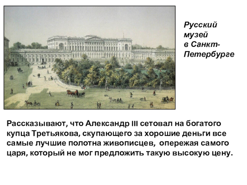 Русском музее. Открыт он был в конце XIX века и первоначально носил имя императора Александра III, который всячески содействовал тому, чтобы в тогдашней столице России на средства государства создать общедоступный музей.
