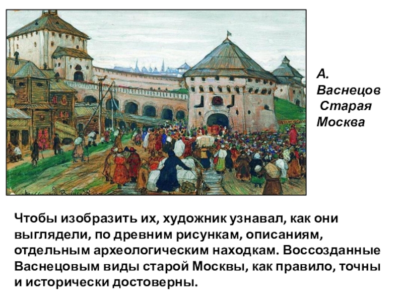выглядели, по древним рисункам, описаниям, отдельным археологическим находкам. Воссозданные Васнецовым виды старой Москвы, как правило, точны и исторически достоверны.