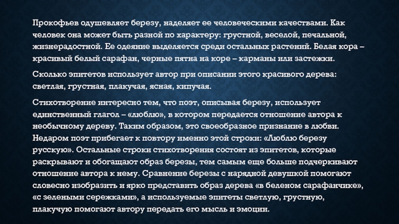 Слайд 12Прокофьев одушевляет березу, наделяет ее человеческими качествами. Как человек она может