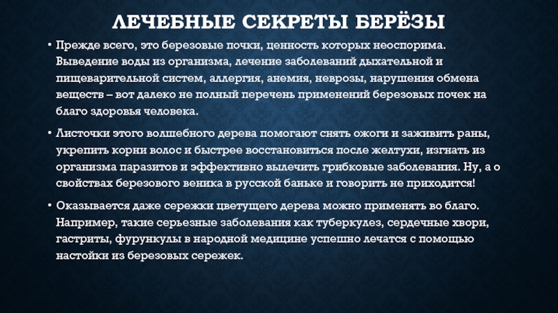 Листочки этого волшебного дерева помогают снять ожоги и заживить раны, укрепить корни волос и быстрее восстановиться после желтухи, изгнать из организма паразитов и эффективно вылечить грибковые заболевания. Ну, а о свойствах березового веника в русской баньке и говорить не приходится!