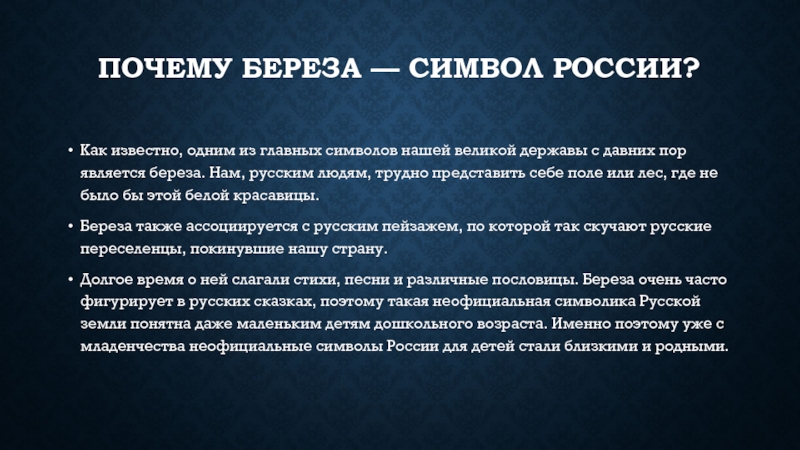 Долгое время о ней слагали стихи, песни и различные пословицы. Береза очень часто фигурирует в русских сказках, поэтому такая неофициальная символика Русской земли понятна даже маленьким детям дошкольного возраста. Именно поэтому уже с младенчества неофициальные символы России для детей стали близкими и родными.