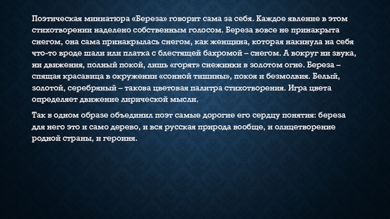 стихотворении наделено собственным голосом. Береза вовсе не принакрыта снегом, она сама принакрылась снегом, как женщина, которая накинула на себя что-то вроде шали или платка с блестящей бахромой – снегом. А вокруг ни звука, ни движения, полный покой, лишь «горят» снежинки в золотом огне. Береза – спящая красавица в окружении «сонной тишины», покоя и безмолвия. Белый, золотой, серебряный – такова цветовая палитра стихотворения. Игра цвета определяет движение лирической мысли.