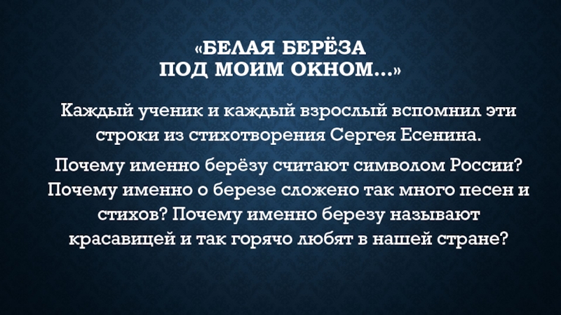 Почему именно берёзу считают символом России? Почему именно о березе сложено так много песен и стихов? Почему именно березу называют красавицей и так горячо любят в нашей стране?