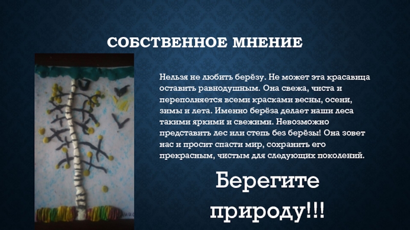 Она свежа, чиста и переполняется всеми красками весны, осени, зимы и лета. Именно берёза делает наши леса такими яркими и свежими. Невозможно представить лес или степь без берёзы! Она зовет нас и просит спасти мир, сохранить его прекрасным, чистым для следующих поколений.
