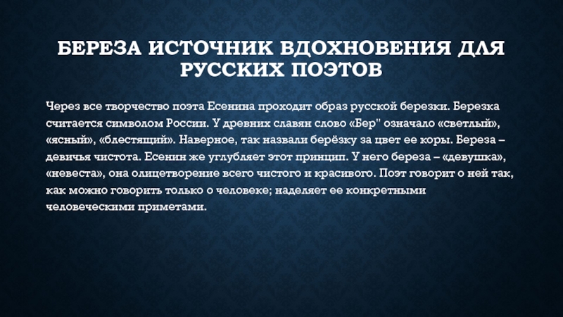 образ русской березки. Березка считается символом России. У древних славян слово «Бер" означало «светлый», «ясный», «блестящий». Наверное, так назвали берёзку за цвет ее коры. Береза – девичья чистота. Есенин же углубляет этот принцип. У него береза – «девушка», «невеста», она олицетворение всего чистого и красивого. Поэт говорит о ней так, как можно говорить только о человеке; наделяет ее конкретными человеческими приметами.