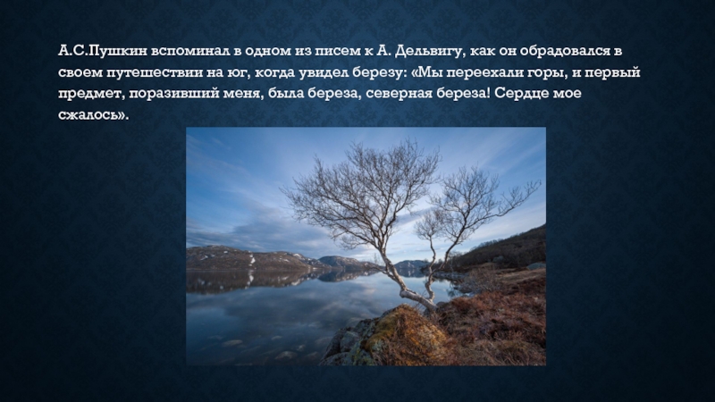 обрадовался в своем путешествии на юг, когда увидел березу: «Мы переехали горы, и первый предмет, поразивший меня, была береза, северная береза! Сердце мое сжалось».