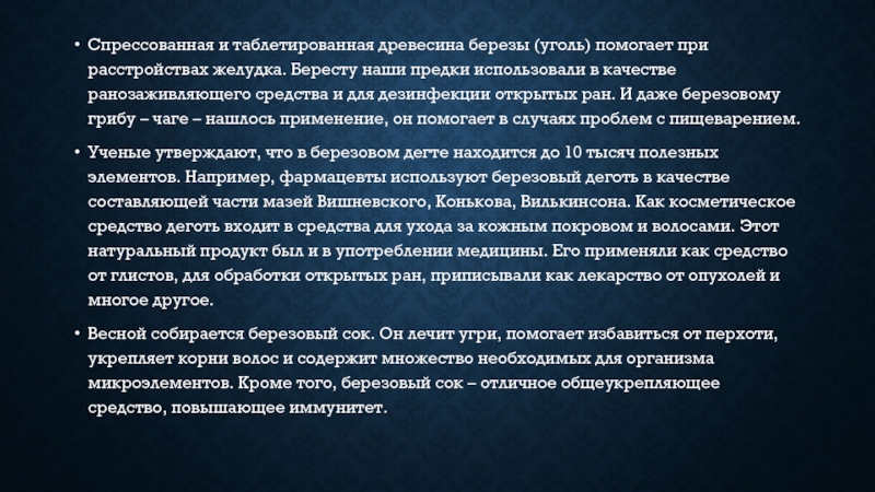 Слайд 8Спрессованная и таблетированная древесина березы (уголь) помогает при расстройствах желудка. Бересту