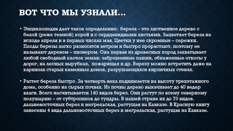 Растет береза быстро .За четверть века поднимается на высоту трехэтажного дома, особенно на сырых почвах. Из почвы дерево выкачивает до 40 ведер влаги. Всего насчитывается 140 видов берез. Они растут по всему северному полушарию – от субтропиков до тундры. В нашей стране их до 70 видов. дальневосточных берез и мегрельская, растущая на Кавказе. В Красную книгу занесены 4 вида дальневосточных берез и мегрельская, растущая на Кавказе.