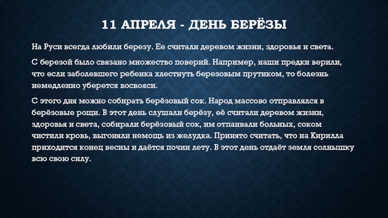 С этого дня можно собирать берёзовый сок. Народ массово отправлялся в берёзовые рощи. В этот день слушали берёзу, её считали деревом жизни, здоровья и света, собирали берёзовый сок, им отпаивали больных, соком чистили кровь, выгоняли немощь из желудка. Принято считать, что на Кирилла приходится конец весны и даётся почин лету. В этот день отдаёт земля солнышку всю свою силу.