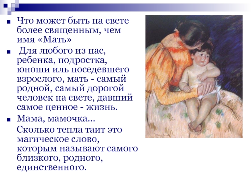 и в этом слове сосредотачивается для него все, оно становится равнозначным слову «жизнь». Человек зовет мать и верит, что, где бы она ни была, она слышит его, сострадает, спешит на помощь.