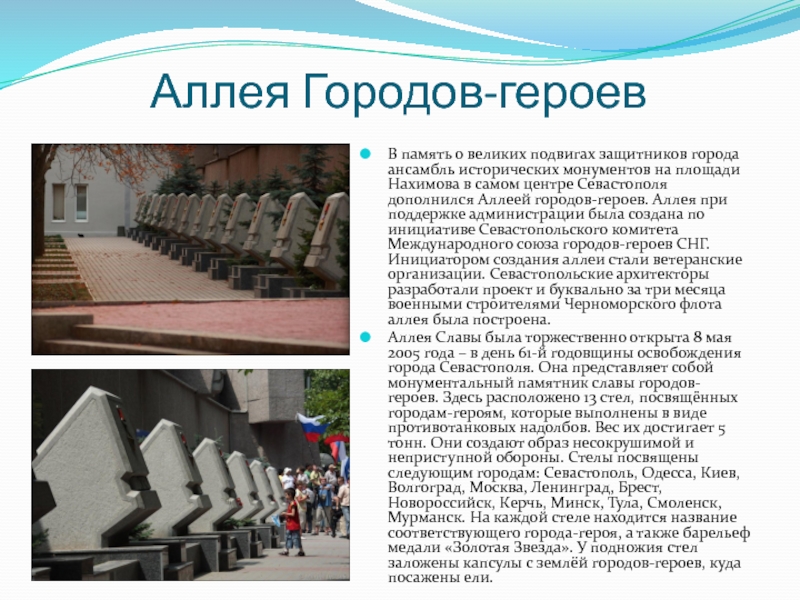 на площади Нахимова в самом центре Севастополя дополнился Аллеей городов-героев. Аллея при поддержке администрации была создана по инициативе Севастопольского комитета Международного союза городов-героев СНГ. Инициатором создания аллеи стали ветеранские организации. Севастопольские архитекторы разработали проект и буквально за три месяца военными строителями Черноморского флота аллея была построена.