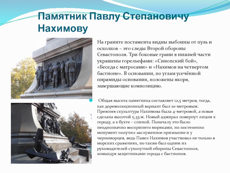 осколков – это следы Второй обороны Севастополя. Три боковые грани в нижней части украшены горельефами: «Синопский бой», «Беседа с матросами» и «Нахимов на четвертом бастионе». В основании, по углам усечённой пирамиды основания, положены якоря, завершающие композицию.