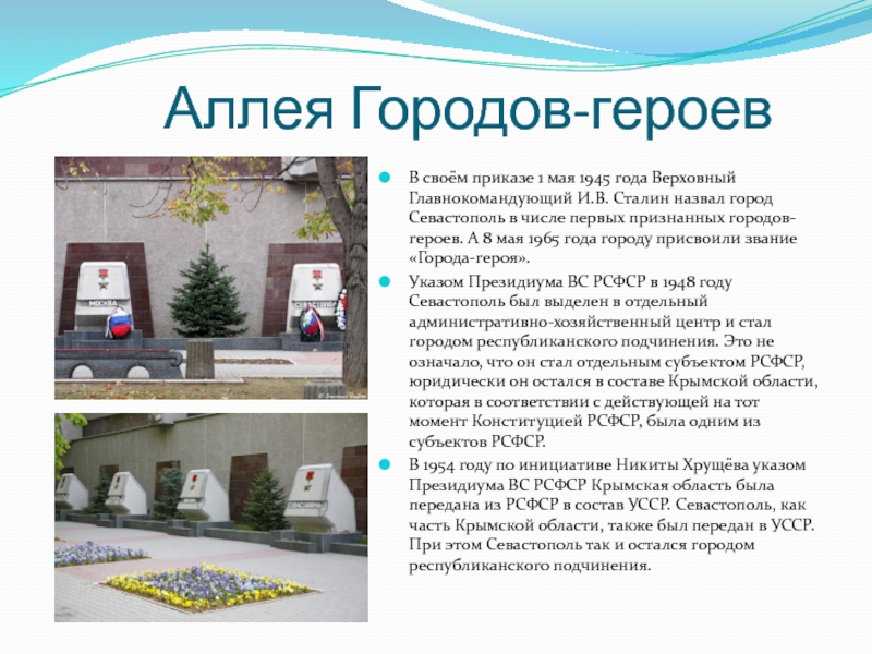 Сталин назвал город Севастополь в числе первых признанных городов-героев. А 8 мая 1965 года городу присвоили звание «Города-героя».