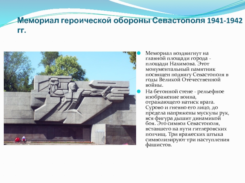 - площади Нахимова. Этот монументальный памятник посвящен подвигу Севастополя в годы Великой Отечественной войны.