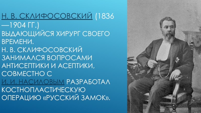 выдающийся хирург своего времени. Н. В. Склифосовский занимался вопросами антисептики и асептики, совместно