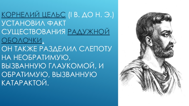 Слайд 10Корнелий Цельс (I в. до н. э.) установил факт существования радужной оболочки.