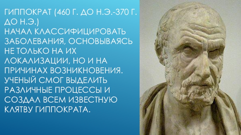 не только на их локализации, но и на причинах возникновения. Ученый смог выделить различные процессы и создал всем известную клятву Гиппократа.