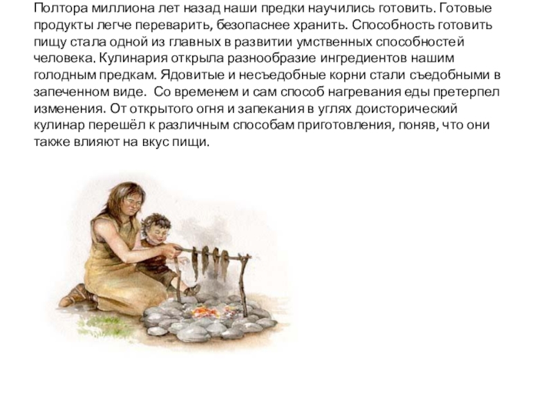 Слайд 7Полтора миллиона лет назад наши предки научились готовить. Готовые продукты легче